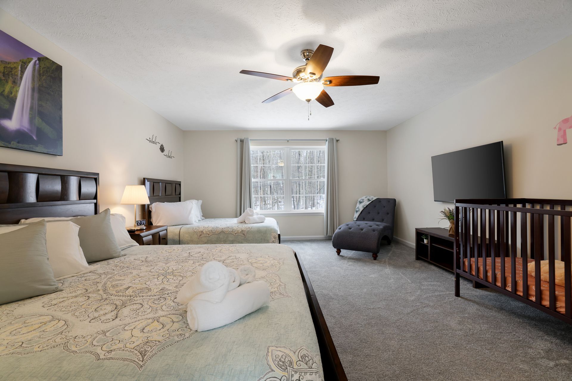 Inside, you'll find a diverse range of sleeping arrangements to suit everyone's needs. Rest comfortably in a king-size bed, queen beds, a full bed, bunk beds, and even a convenient crib for the little ones. Plus, the game room is equipped with an extra queen sofa bed, providing flexible sleeping arrangements for unexpected guests or simply a comfortable place to relax and unwind. Whether you're unwinding after a day of exploration or simply enjoying the serene atmosphere, this property offers unparalleled comfort and warmth, creating an inviting space for relaxation and enjoyment.